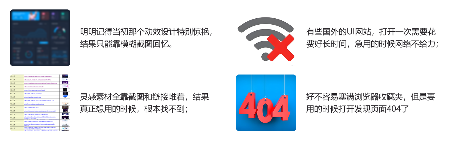 在收集UI素材时,我们经常通过刷 Behance、Dribbble、Awwwards等网站去找UI灵感。每次看到一个极具质感的 UI 页面,我们立刻 Ctrl+D 收藏或者截图+保存链接留档。但过几天再点开,要么就是页面 404 了,要么就是网页改版了,要么就是网络问题打不开。这些问题,不仅是只有我才经历过: