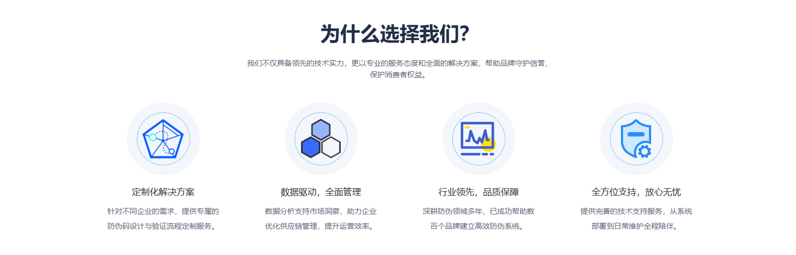为什么要选择这个平台呢?它不仅技术领先,更有着专业的服务态度和全面的解决方案。定制化服务为不同企业打造专属的防伪码设计与验证流程;数据驱动助力企业洞察市场、优化供应链、提升运营效率;深耕防伪领域多年,数百个品牌成功案例就是实力见证;完善的技术支持从系统部署到日常维护全程相伴,让企业和消费者没有后顾之忧。