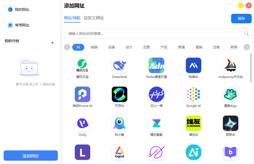 点击应用台下方的【添加】图标,可以搜索查找你需要用到的网站,单击就可以把它们置入科达云桌面。如果有些网址没有的,你还可以自定义添加。