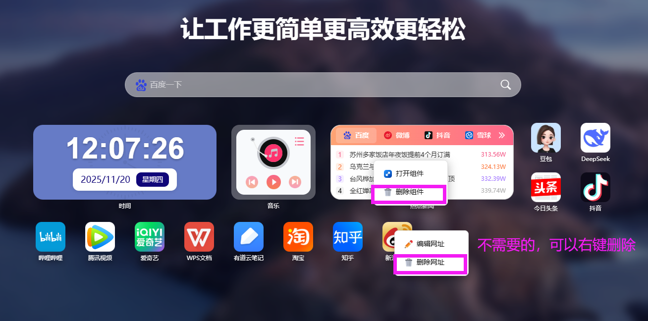 回到科达云桌面,我们可以自由拖动桌面的组件、网址,来调整它们的顺序,如果不需要的也可以右键把它们移除;底部的应用工具也是同样的操作。