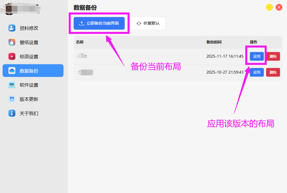 如果你已经布置好了以上的内容,千万别忘了备份当前界面。点击应用台下方的【设置】图标,找到数据备份,点击【立即备份当前界面】,就可以把当前的布局版本给记录下来,即便后面你更换了布局,但是又想回到旧版本时,就可以点击【应用】,复原回去。
