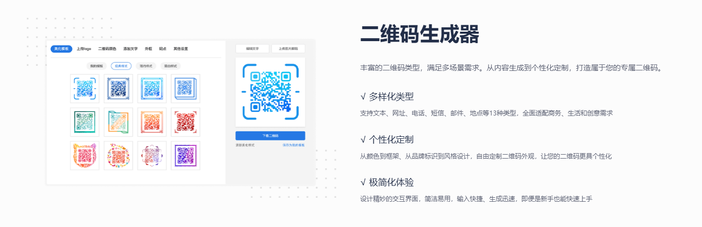 在这个信息飞速流转的时代,二维码已经成为连接线上线下、传递信息的关键桥梁。无论是商务推广、生活分享还是创意表达,一个好用的二维码生成工具都至关重要。今天就给大家分享一款功能超强大的二维码生成器,轻松解决各类二维码需求!立即点击体验!这款二维码生成器的功能丰富到超乎想象,支持文本、网址、电话、短信、邮件、地点等 13 种类型。不管你是想随时随地分享一段文字内容,还是引导用户访问特定网页,又或是通过二维码分享文件、社交名片,它都能轻松实现。就算想生成视频二维码,让用户在线播放无卡顿高清视频,它也不在话下,全方位适配各种场景。个性化定制是它的一大亮点。从二维码的颜色选择,到框架设计,再到添加品牌标识 —— 上传 logo,都能自由设置。还有添加文字、外框、码点等细节设计,多种美化模板供你挑选,比如经典样式、简约样式、黑白样式等,让你的二维码告别千篇一律,彰显独特个性,完美契合品牌风格。对于操作小白来说,上手难度为零。它的交互界面设计精妙,简洁易用,输入信息方便快捷,生成二维码的速度更是快到飞起。哪怕是第一次接触,也能迅速掌握,轻松制作出满意的二维码。不仅如此,它还自带智能数据分析功能,这可是营销推广的得力助手。通过多维智能数据分析,能深入了解用户行为。像用户分布统计,能精确到每个省份、城市的用户行为数据,助力精细化运营与本地化推广;推广效果统计,可以追踪用户扫码频率和来源,为活动效果提供实时反馈,方便及时调整营销策略;使用设备统计,则能分析不同设备类型的用户偏好,针对不同渠道优化调整,提升用户访问体验。如此强大又实用的二维码生成器,绝对是营销推广、日常分享的宝藏工具。还在等什么?赶紧去体验,开启你的营销智能之旅,让二维码为你的事业和生活添砖加瓦!立即点击体验!