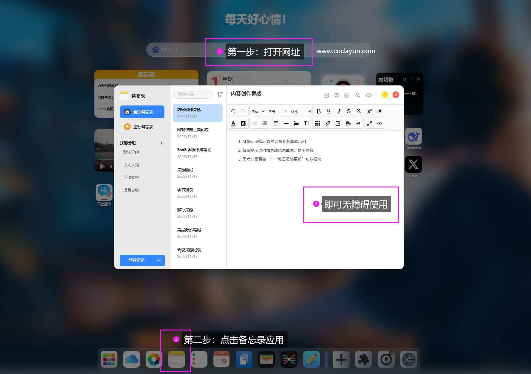 在这个万物皆可“All-in-One”的时代,我们似乎陷入了一个怪圈: 很多时候,灵感是稍纵即逝的。当你有个点子迫切想要记录下来的时候,你怎么还能等待得了软件启动更新、关闭广告的时间呢。 工具直达:科达云在线备忘录 科达云在线备忘录整个界面非常干净,没有任何多余的干扰元素。它提供了一个丰富的编辑器,如加粗、高亮、列表、引用……你需要的排版功能它都有。 如果只是简单记录,那系统自带的记事本也能做。但科达云之所以能成为个人生产力高效工具,是因为它在“好用”和“专业”之间找到了平衡。 在使用过程中,我还发现了几个很哇塞的意外之喜: