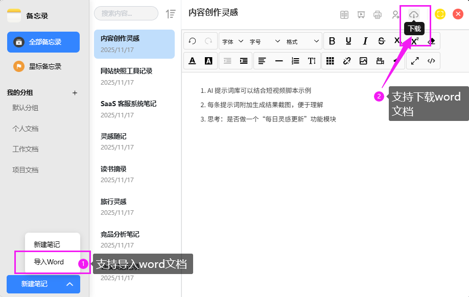 2、对“文档人”极度友好: 很多在线笔记最让人头疼的是“孤岛效应”——写进去容易,拿出来难。科达云这点做得非常良心,它支持导入Word文档,也能一键下载成Word文档。 这意味着,你可以在这里完成初稿,然后直接导出成标准格式发给老板或客户,不用再复制粘贴去重新排版。